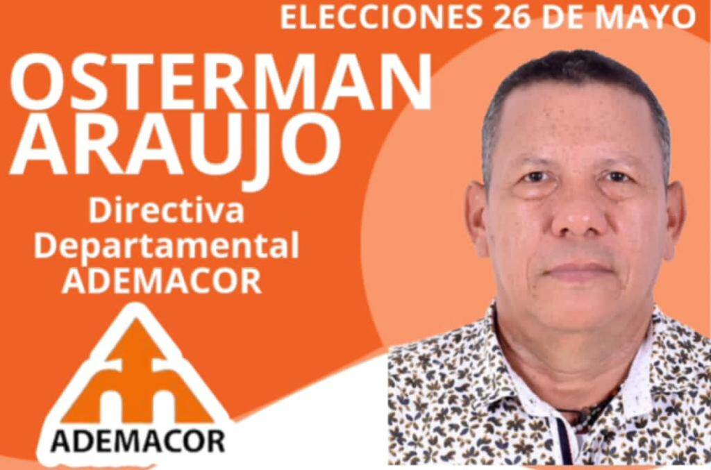 El dirigente sindical del magisterio cordobés , Osterman Araújo Díaz, actual Directivo Central de Ademacor, espera una vez más el respaldo este 26 de mayo para seguir fortaleciendo la lucha por la defensa de la educación pública, los derechos del magisterio y del pueblo colombiano en general.