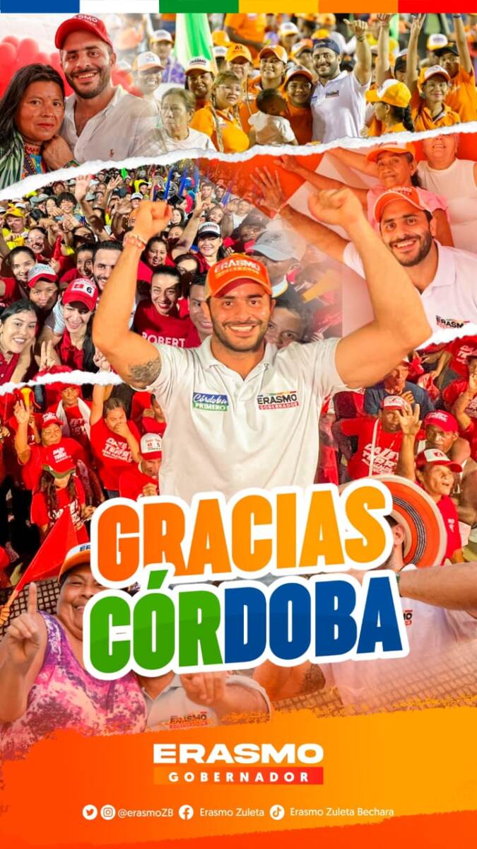 «Gracias Córdoba, gracias equipo, gracias familia», fueron las primeras palabras Erasmo Zuleta Bechara, elegido por los cordobeses como su Gobernador, superando los 506.000 votos, con un 95.6% de las mesas escrutadas.