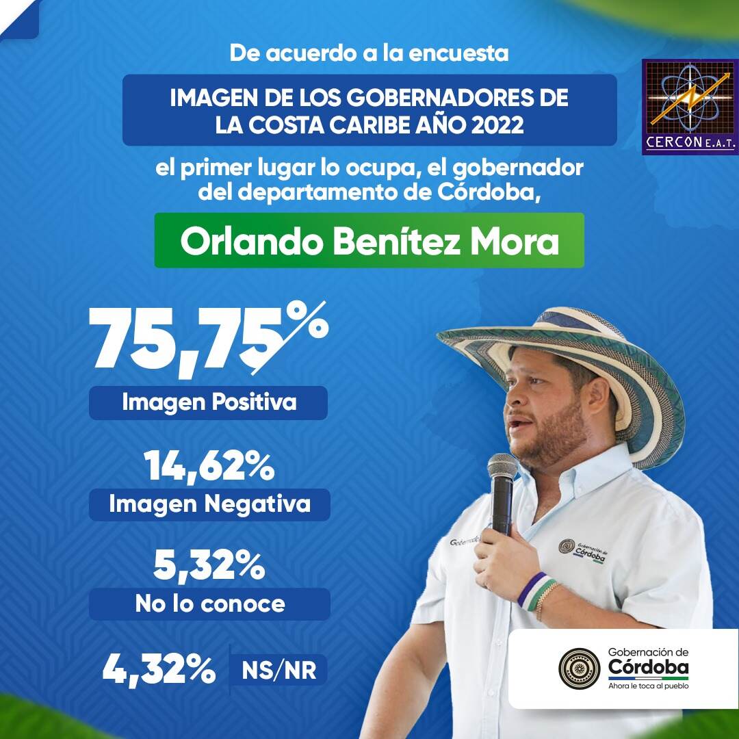 Siguen las buenas noticias para Córdoba. De acuerdo al Centro Nacional de Consultoría y Proyección de Imagen CERCON, el Gobernador de los cordobeses, Orlando Benítez Mora, se ubica con la mayor imagen positiva entre los siete mandatarios de la costa caribe colombiana. Según la encuesta, realizada en las 7 capitales de la región, el Gobernador de Córdoba, obtiene un 75.75% de imagen positiva.